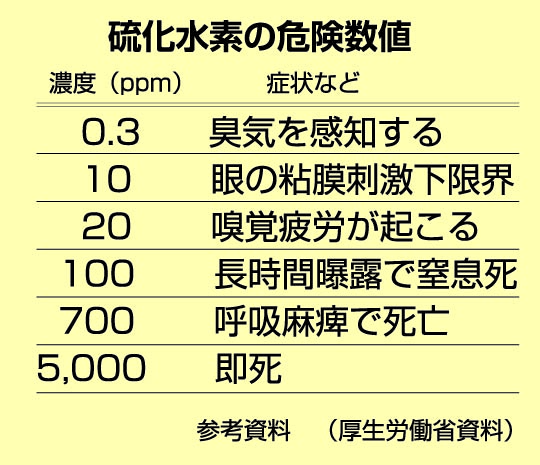 硫化水素は嗅覚の麻痺や眼の損傷、呼吸障害・肺水腫を引き起こし、死に至る場合もあります。労働安全衛生法や悪臭防止法でも基準値が定められています。